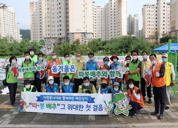 의정부시자원봉사센터(이사장 이용걸)는 8월 21일(금) 오후 3시 따봉배추(따뜻한 봉사자가 심은 배추)를 유휴 국유지(의정부 낙양동 소재)에서 캠코(한국자산관리공사) 등 4개 유관기관(캠코, 송산3동 행정복지센터, NH농협 의정부시지부, 의정부농협) 임직원들과 의정부 자원봉사단체(민주평화통일자문회의의정부시지회, 의정부나눔축구봉사단, 신우신협 두손모아봉사단, 의정부농협 고향을 생각하는 주부들의 모임, 의정부시자율방범연합회, 한국자유총연맹의정부시지회, 송산3동 주민자치위원회)가 참석한 가운데 소외계층 김장나눔 지원을 위한 배추 및 무 2000포기 모종심기를 실시했다.