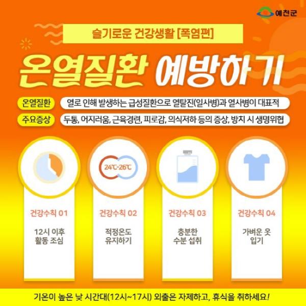 예천군 관계자는 “온열질환 감시체계를 지난 5월 20일부터 9월 30일까지 운영하고 있으며 건강한 여름을 날 수 있도록 물 자주 마시기, 더운 시간대 휴식하기 등 건강 수칙을 준수하길 바란다.”며 “또한, 보건지소와 진료소 등 보건기관을 무더위 쉼터로 운영하고 있으니 적극 이용하시길 바란다.”고 말했다.