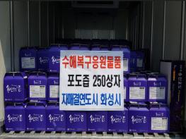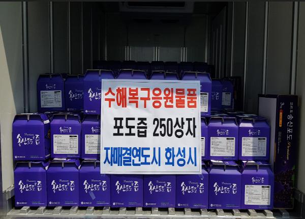 합천군(군수 문준희)은 지난 21일, 자매결연도시 화성시(시장 서철모)로부터 수해복구 응원물품 포도즙(20포) 250상자(500만원 상당)를 전달받았다고 밝혔다.