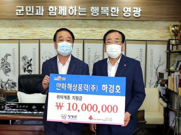 지난 20일 안마해상풍력(주)(대표 하경호)에서 우리군 취약계층 위기가정을 위해 사용해 달라며 희망이 모이는 영광곳간에 천만원을 기탁하였다.