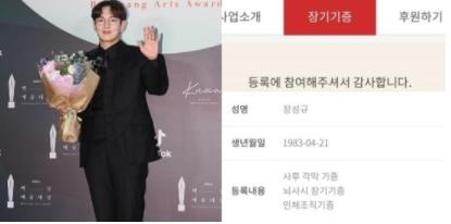 장성규는 24일 자신의 인스타그램에 장기 기증에 등록한 화면을 캡처해 첨부했다. 화면에는 사후 각막 기증, 뇌사시 장기 기증, 인체 조직 기능을 등록한 내용이 나와 있다.