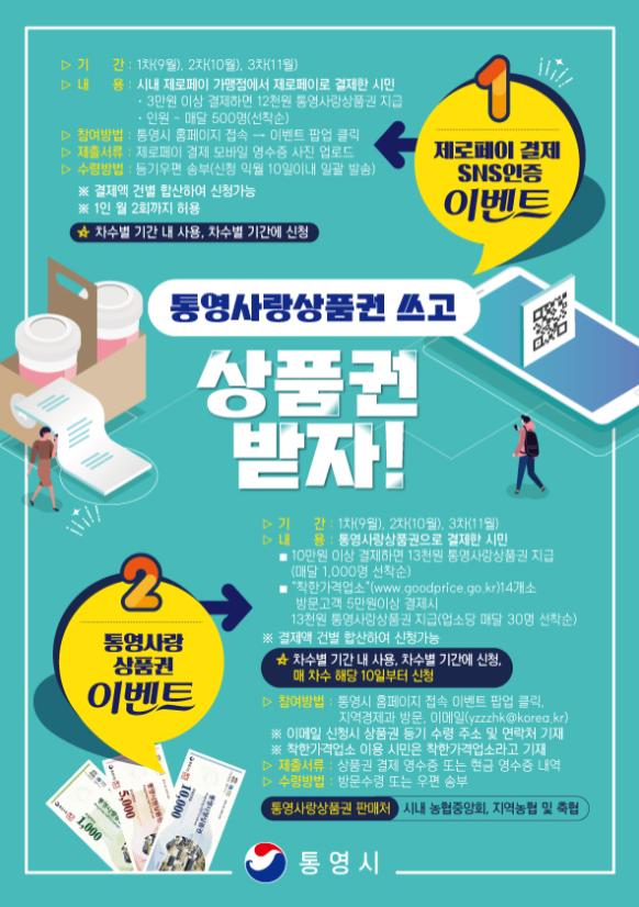이벤트는 제로페이 결제 SNS인증 이벤트와 통영사랑상품권 이벤트로 9월, 10월, 11월 3차에 걸쳐 진행된다.