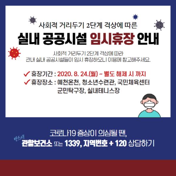 이번에 운영을 중단하는 공공시설은 예천온천을 비롯해 군민 탁구장, 실내 테니스장, 국민체육센터, 청소년수련관이며 추후 코로나19 상황에 따라 재개를 결정할 방침이다.