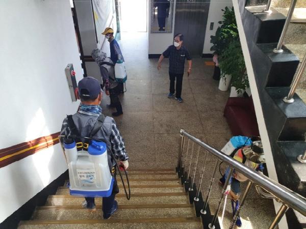 25일(화) 오전 10시부터 어모면 이장협의회 회원 및 직원들이 코로나-19 2차 확산 방지를 위해 관내 경로당과 중교시설을 중심으로 방역활동을 실시했다.
