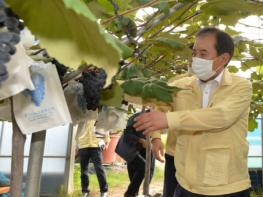 24일 박윤국 포천시장은 포도 직판매장을 방문해 “올해는 봄철 저온과 긴 장마로 포천 재배에 많은 어려움이 있었다. 화진(꽃떨이 현상)으로 수확량도 감소하고, 병해가 많았음에도 맛있는 포도를 재배해주셔서 감사하다.”라며 농가를 격려하고, 다른 어려움이 없는지 살폈다.