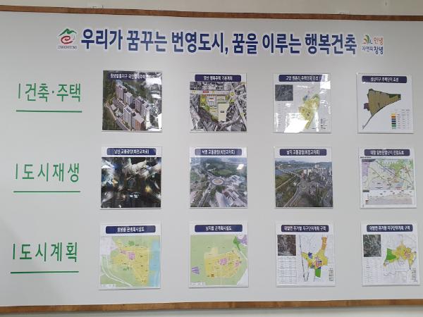 현황판은 인구증가 시책에 도움이 되는 창녕말흘지구 국민임대주택과 영산 행복주택, 고암면·성산면 전원주택 단지조성 사업안내를 시작으로, 그동안 추진한 남산·낙영·남지 교통광장 공사 추진실적이 중앙에 배치됐다.