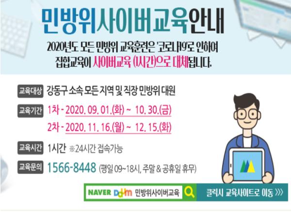 교육대상자는 강동구청 홈페이지 또는 인터넷 포털사이트에서 ‘민방위 사이버교육’으로 검색해 해당 교육사이트(http://www.cmes.or.kr)에 접속한 뒤 본인인증을 거쳐 교육을 받으면 된다. 사이버 교육인 만큼, 시간에 상관없이 수강 가능하다.