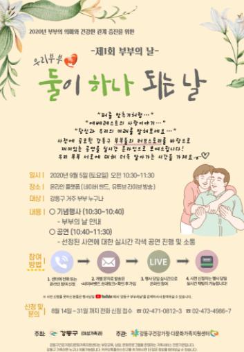 강동구(구청장 이정훈)가 오는 9월 5일 제1회 부부의 날 기념행사인 “우리부부, 둘이 하나 되는 날”을 온라인으로 진행한다.