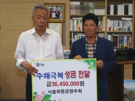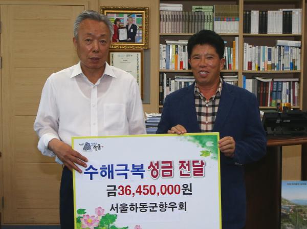 또한 같은 날 서울하동향우회(회장 소재권)가 고향의 수재민에게 전해달라며 3645만원을 보내왔으며, 앞서 지난 24일에는 한국전력공사 경남본부(본부장 유현호)가 2000만원의 수해 기부금을 내놨다.