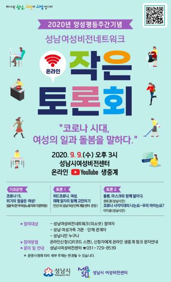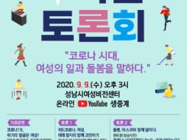 성남시는 오는 9월 9일 오후 3시~5시 ‘코로나 시대, 여성의 일과 돌봄을 말하다’를 주제로 한 온라인 토론회를 개최한다.