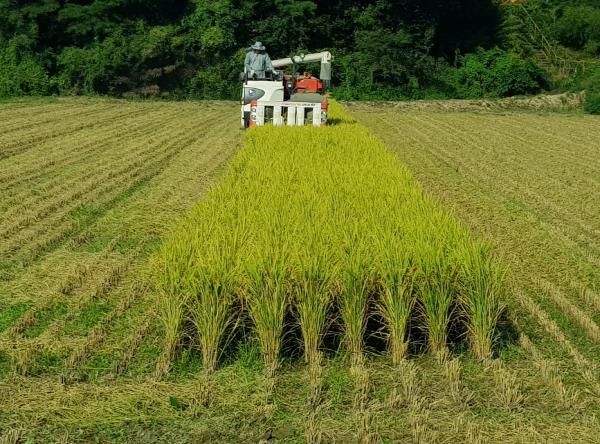 고성군(군수 백두현)은 8월 24일 동해면 양촌리 정태영 농가 5필지(8,300㎡)에서 폭염을 극복하고 풍년을 알리는 벼의 첫 수확을 했다고 밝혔다.