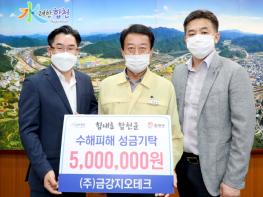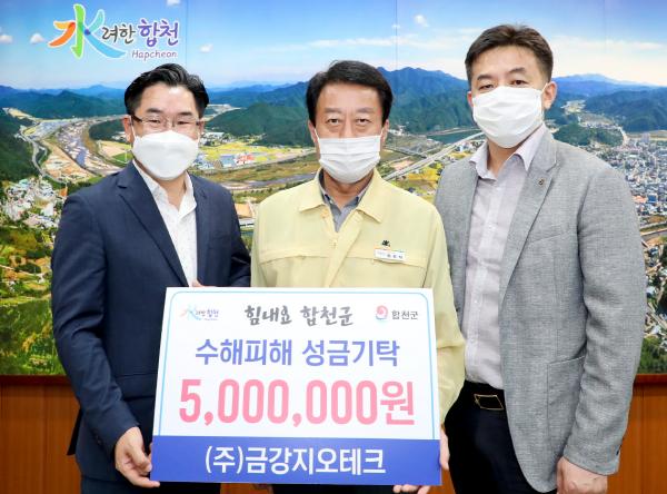 지난 25일 ㈜금강지오테크(대표 이동욱)는 수해 피해로 힘든 시기를 겪고 있는 수해민에 써달라며 합천군(군수 문준희)에 긴급수해복구 성금 5백만원을 기탁했다.
