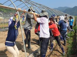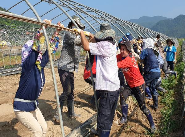 찢겨진 폐비닐을 제거하고 주변쓰레기를 정리했으며 휘어진 하우스 대를 다 함께 밀어 올려 바로 세우는 등 무더운 날씨에 구슬땀을 흘렸다.
