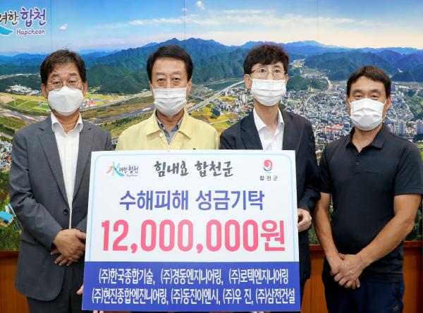 지난 25일 ㈜한국종합기술(대표 이상민)외 6개사[㈜로텍엔지니어링(대표 권무현), ㈜동진이엔시(대표 김창수), ㈜경동엔지니어링(대표 강재홍), ㈜현진종합엔지니어링(대표 이효형), ㈜우진(대표 신일섭), ㈜삼전건설(대표 황기옥)]은 수해 피해로 힘든 시기를 겪고 있는 수해민에 써달라며 합천군(군수 문준희)에 수해복구 성금 1,200만원을 기탁했다.