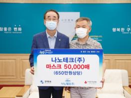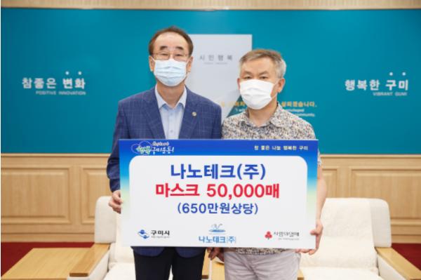 구미시(시장 장세용)는 8. 26(수) 나노테크(주)(대표이사 김정헌)에서 코로나19 예방용 마스크 5만매를 기탁받았다.