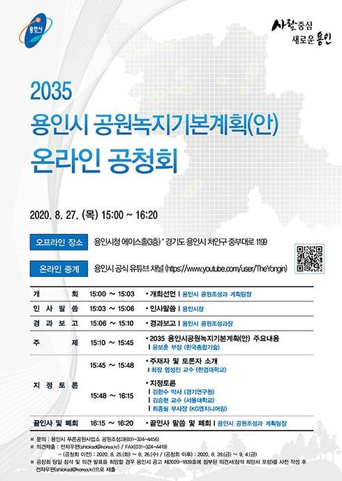 용인시는 27일 오후3시 시청 에이스홀에서 ‘2035년 용인시 공원·녹지 기본계획(안)’에 대한 주민공청회를 연다.