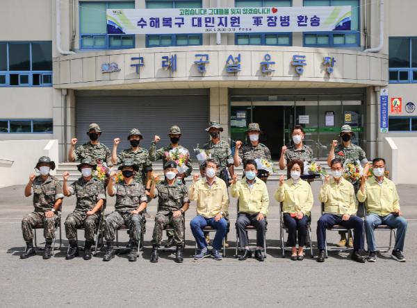 차량에 탑승한 장병들을 격려하기 위해 구례군청 직원들이 거리에 나와 격려 현수막을 펼치고 열렬히 환송했다. 사회적 거리두기 2단계로 인해 최소한의 인원만 참석했다.