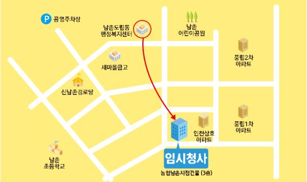 임시청사는 현 청사 인근 남촌동로25번길 43, 남인천농협 남촌지점 건물 3층이며, 한 층에 민원실과 사무 공간, 동대본부가 위치하게 된다.