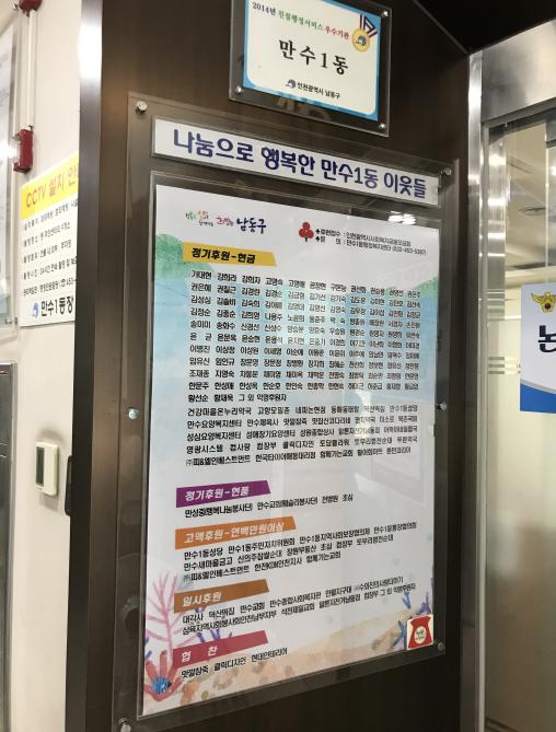 인천시 남동구 만수1동 행정복지센터(동장 이상정)는 어려운 이웃을 위해 현금과 현물을 기부하고 있는 후원자들의 현황을 모아 ‘나눔으로 행복한 만수1동 이웃들’현판을 제작했다고 26일 밝혔다.