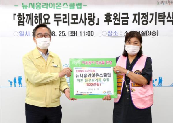 뉴시흥라이온스클럽(회장 이정효)은 이날 금천구 미혼 한부모가족들을 위해 1가구당 연60만원씩, 총 10가구에 600만원의 후원금을 지정 기탁했다.