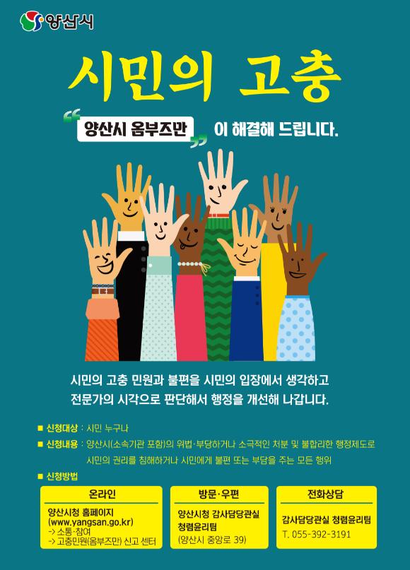 민원 신청방법은 양산시 홈페이지(소통?참여-고충민원 옴부즈만 신고센터), 직접 방문(양산시청 감사담당관실 청렴윤리팀), 우편, 팩스(055-392-2109)로 신청하면 된다.
