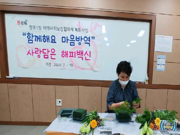 당초 장유1동 행정복지센터에서 꽃꽂이 강사와 참여자가 함께 현장실습 형식으로 진행할 예정이었으나 사회적 거리두기 강화에 따라 비대면 방식으로 전환했다.