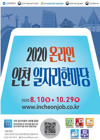 인천광역시(시장 박남춘)와 인천지방중소벤처기업청, 한국산업단지공단 인천지역본부, 중부지방고용노동청, 인천병무지청이 공동개최하는 ‘2020 온라인 인천 일자리한마당’이 채용인원 160명을 목표로 8월28일부터 10월29일까지 온라인 상에서 개최된다.