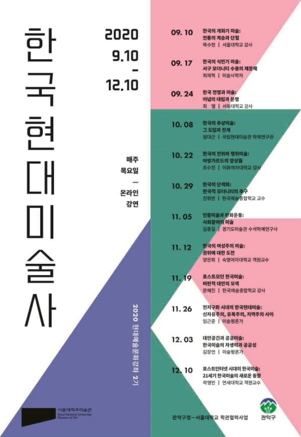 이번 강의는 한국의 개화기 미술부터 전쟁, 포스트모던, 포스트인터넷 시대 등 한국 현대 미술을 총망라하는 12개 강좌로 구성되어 9월 10일부터 매주 목요일 온라인으로 실시된다.
