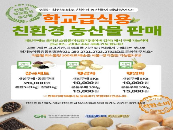 경기도와 경기농식품유통진흥원은 먼저 지난 19일부터 온라인 쇼핑몰 마켓경기(market.gg.co.kr)에서 잡곡과 햇감자, 햇양파 등 친환경 학교급식 농산물 판매를 시작했다. 잡곡세트(혼합5곡 1kg와 참쌀 1kg)는 2만원, 햇감자와 햇양파는 5kg에 1만원, 공동구매로 사면 10kg에 1만5천원에 구매할 수 있다.