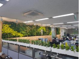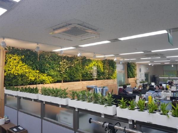 ‘그린힐링오피스’는 공기정화식물을 활용하여 바이오월(식물공기정화시스템), 파티션 화분을 설치한 것을 말하며, 실내 공기오염물질(휘발성유기화합물, 초미세먼지 등) 농도를 낮춰 실내 공기질을 개선하는 효과가 있다.