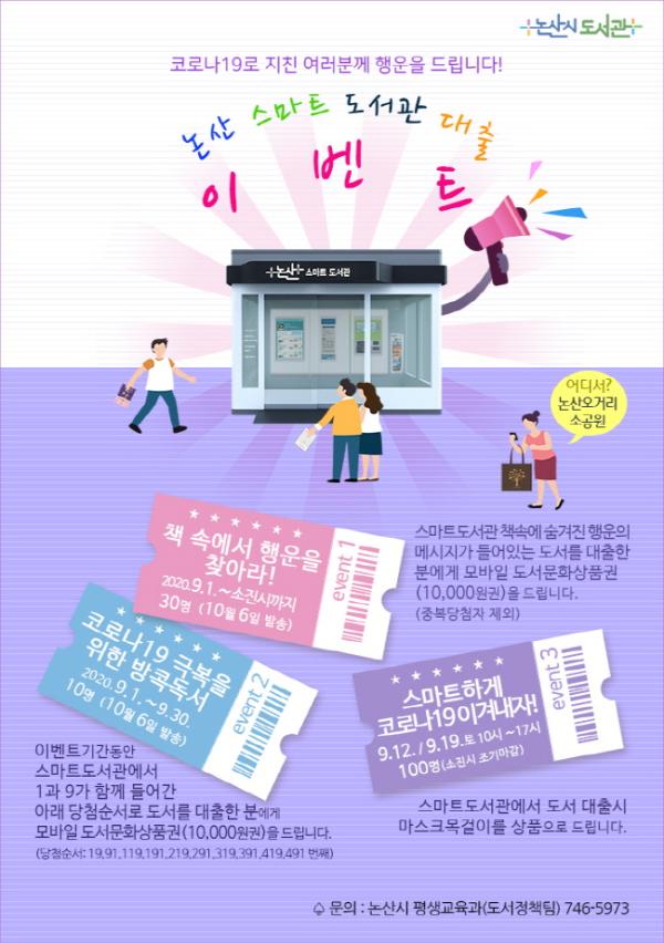마지막으로 ‘스마트하게 코로나19를 이겨내자’이벤트를 통해 스마트 도서관을 이용해 도서를 대출하는 시민에게 코로나19 예방을 위한 마스크 목걸이를 증정할 예정이며, 9월 둘째 주 토요일(12일)과 셋째 주 토요일(19일) 10시부터 17시까지 선착순 100명으로 진행된다.