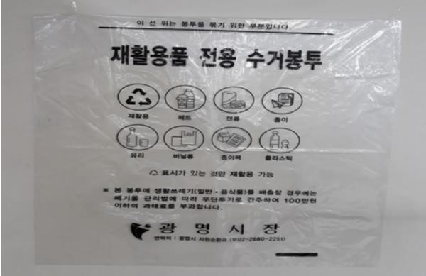 이를 해결하고자 광명시는 내용물이 보이는 투명한 재활용전용 수거봉투 75리터 1만 4000여 매를 특별 제작했으며, 시범 운영을 위해 광명3동 지역 주민 3546세대에 각 4매씩 전달할 예정이다.