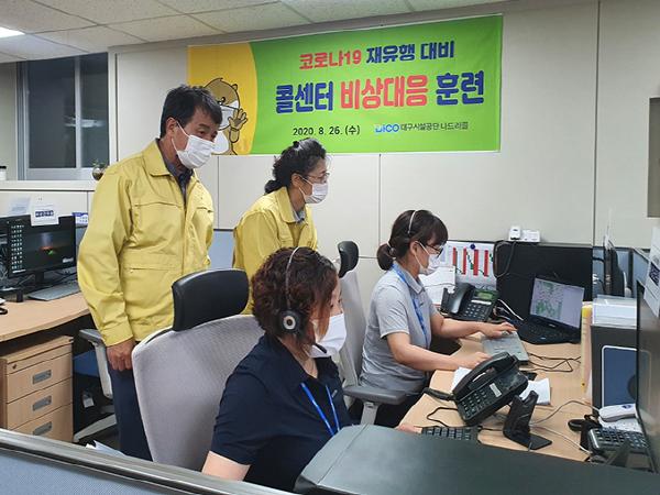 대구시설공단(이사장 김호경) 나드리콜은 지난 26일 최근 사회적 거리두기가 2단계로 격상되고 지역 내 위기감이 고조됨에 따라 코로나19 확진자 발생으로 콜센터가 폐쇄될 상황을 대비한 모의훈련을 실시했다.