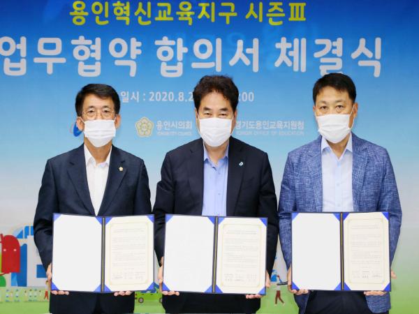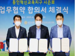 용인시는 27일 시장실에서 백군기 용인시장,이윤식 용인교육지원청장, 김기준 용인시의회 의장이‘용인형 혁신교육지구 시즌Ⅲ’ 업무협약에 관한 합의서를 교환했다고 밝혔다.