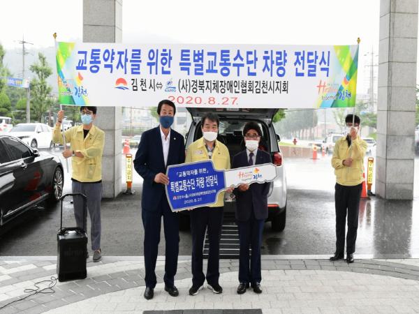 김천시는 8월 27일 김충섭 김천시장과 박희만 경북지체장애인협회김천지회장 및 회원, 지역주민 등 20여명이 참석한 가운데 특별교통수단 차량 전달식을 가졌다.