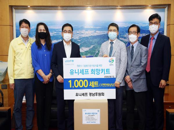 유니세프 희망키트는 사회적 거리두기 2단계 격상으로 코로나 발생 추이에 따라 제작일이 연기돼 향후 전달될 예정이다. 희망키트는 창원지역 유니세프 자원봉사자 50명 및 유니세프 경남후원회 관계자들이 구성품 패키지를 포장 제작한다. 키트는 손소독제, 어린이용 마스크 5매, 어린이놀이용품(캐치볼) 1개, 유니세프 물티슈 및 마우스패드로 구성된다.