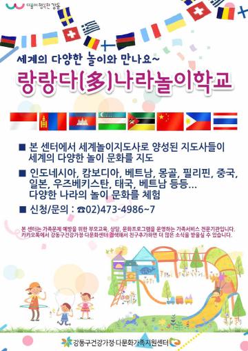 세계 놀이학교 참여를 원하는 아동기관 또는 주민은 강동구청 여성가족과(☎02-3425-5785) 또는 강동구건강가정?다문화가족지원센터(☎02-473-4986~7)로 문의하면 된다.