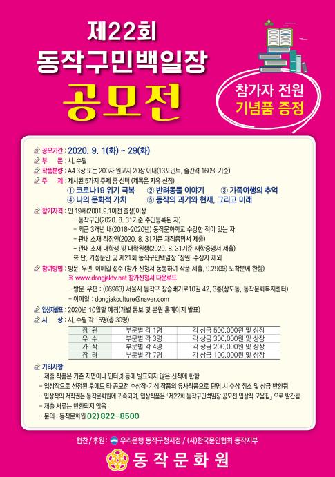 매년 야외행사로 개최됐던 동작구민백일장은 이번 코로나19 사회적거리두기 2단계 격상조치에 따라 감염병 확산방지를 위해 올해는 비대면 방식의 공모전으로 진행한다.