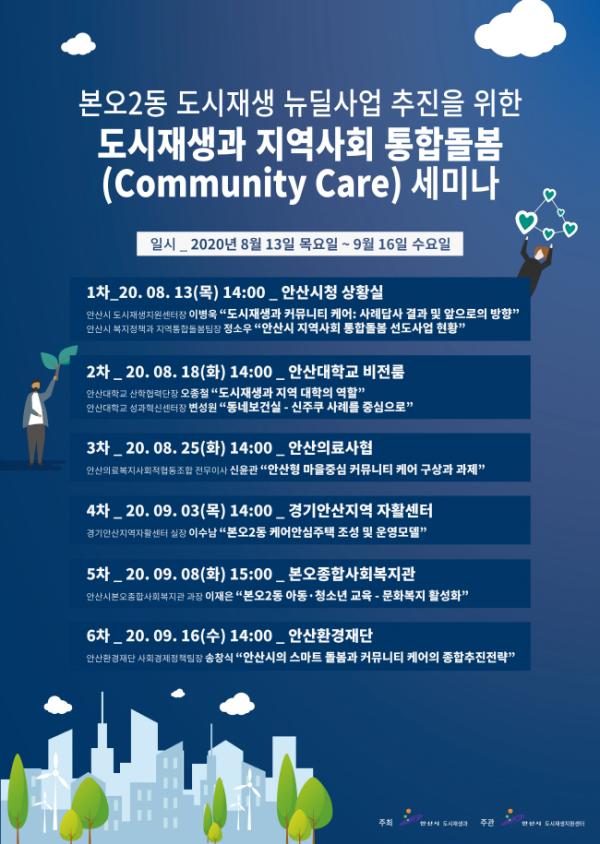 한편 시는 향후 진행 예정인 4~6차 세미나는 본오2동의 케어안심 주택 조성 및 운영모델과 아동·청소년의 교육과 문화복지 활성화 방안, 그리고 안산시의 스마트 돌봄과 커뮤니티 케어의 종합추진전략에 대해 논의할 예정이다.