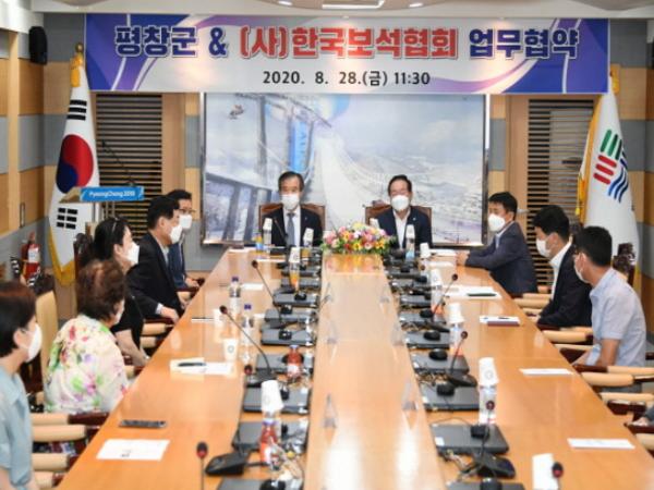 평창군은 노람뜰 일원의 풍부한 수석 & 문화 자원과 연계한 보석 상품의 확보를 통해 역사와 문화가 공존하는 복합 문화 전시를 제공하고자, 사단법인 한국보석협회(회장 홍재영)와 8월 28일 금요일 오전 11시 30분 평창군청 소회의실(2층)에서 한왕기 평창군수 및 관계자 20여명이 참석한 가운데 업무협약을 체결했다고 밝혔다.