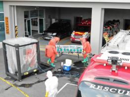 이날 훈련은 현장 진입, 신속한 인명구조, 샘플채취 및 현장응급 제독 실시, 담당 유관기관 인계, 진입대원 개인제독 등의 순으로 진행됐는데 특히 팀워크에 중점을 두고 실시됐다.