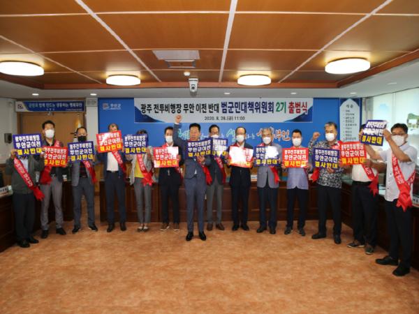 광주 전투비행장 무안 이전 반대 범군민대책위원회(이하 범대위)는 지난 28일 군청 상황실에서 김산 군수와 범대위 상임위원, 김대현 의장, 박성재 의회 광주 군공항 이전 반대 특별위원장 등 20여명이 참석한 가운데 범대위 2기 출범식을 가졌다.
