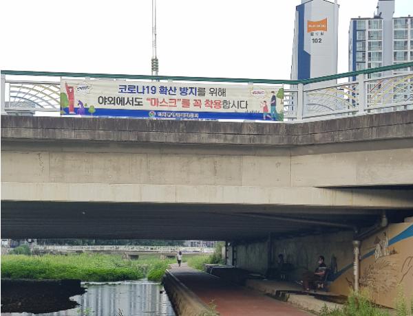 최근 실내에서는 많은 시민들이 마스크를 착용하고 이용하는 반면 산책로나 공원에서는 빈번이 마스크를 착용하지 않는 사례가 발생하고 있어 코로나 확산방지를 위해 ‘야외에서도 마스크를 착용합시다’ 문구를 넣은 현수막을 산책로와 공원에 설치해 비대면 캠페인을 실시했다.