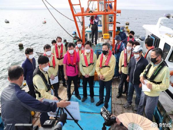 양 지사는 이어 제9호 태풍 ‘마이삭’ 발생에 따른 대응 상황 점검을 위해서도 태안군 내파수도 ‘중층 침설식 가두리 시범 사업 현장’을 찾았다.