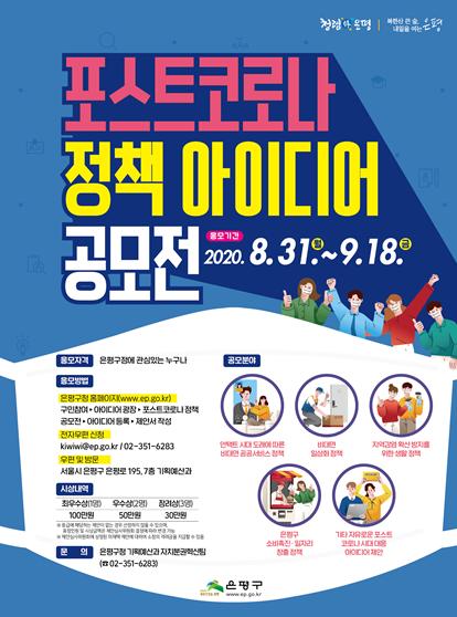 서울특별시 은평구(구청장 김미경)는 은평구정에 관심 있는 모든 사람을 대상으로 8월 31일(월)부터 9월 18일(금)까지 3주 간 「포스트코로나 정책 아이디어 공모전」을 실시한다고 밝혔다.