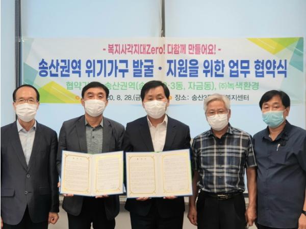 의정부시 송산3동(권역동 국장 윤무현)은 8월 28일 관내 청소대행 업체인 ㈜녹색환경(대표 김성일)과 ‘송산권역 위기가구 발굴·지원을 위한 업무협약’을 체결하였다.