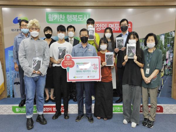 대구광역시 남구청(구청장 조재구)은 지난 28일, 계명대학교 패션디자인과(학과장 홍미정)에서 ‘코로나19 극복 희망나눔 캠페인’의 일환으로 패션디자인과 학생들이 재능나눔으로 직접 만든 특수재질 천마스크 600매를 전달했다고 밝혔다.