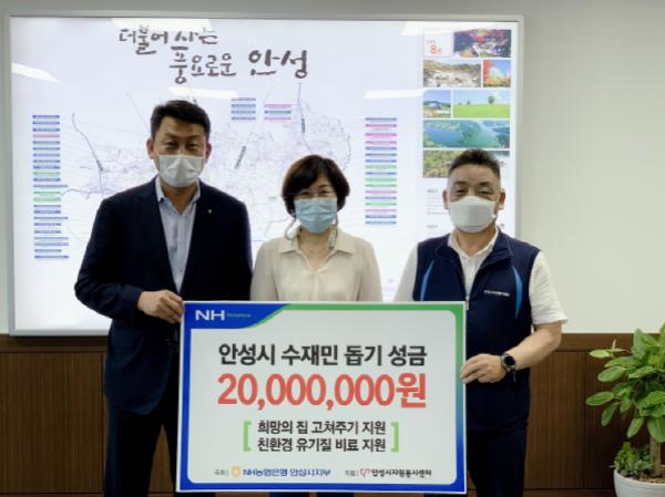 NH농협은행 안성시지부 지부장 김상수는 “전례 없는 긴 장마 후 이어진 폭염과 코로나19 확산으로 수해복구에 어려움을 겪고 있는 이웃들을 위로하고자 후원금을 전달하게 되었다”며 “하루 빨리 피해지역이 복구되어 일상으로 돌아갈 수 있기를 바란다”고 전했다.