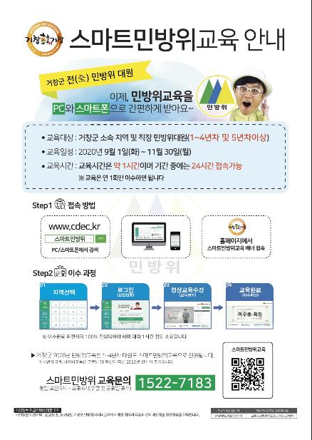 교육대상자는 거창군청 홈페이지에서 민방위교육 링크배너를 클릭하거나 PC나 스마트폰으로 스마트민방위교육(http://www.cdec.kr ) 사이트에 접속해 교육을 받으면 된다.