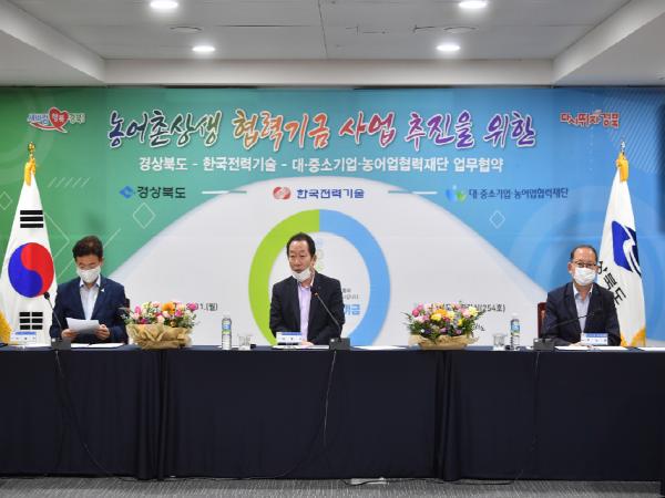 경상북도는 31일 도청 회의실에서 경상북도와 한국전력기술, 대?중소 기업?농어업협력재단(이하 협력재단) 간 ‘농어촌 상생협력기금 지원 사업 공동추진 업무협약’을 체결했다.